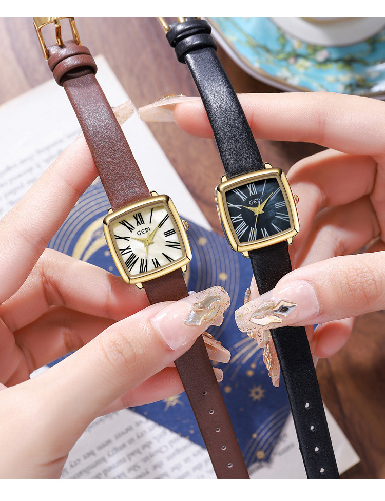 Retro Light Luxury Mother-Of-Pearl Square Disc Leather Quartz Women's Watch